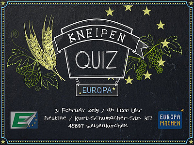 Grübeln, Rätseln und Knobeln waren angesagt beim Kneipenquiz der Europa-Union in der „Destille“ in Buer am 3. Februar 2019. Sie sollte einstimmen auf die Europawahl. Die Tische sind durchnummeriert und auf der Theke stehen kleine Europafahnen. In der „Destille“ ist alles für das bevorstehende Kneipenquiz über Europa vorbereitet. Nach und nach treffen die Kandidaten ein, setzen sich an die Tische, bestellen Getränke und warten gespannt.
