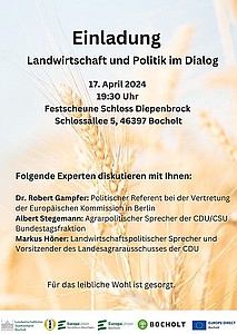Einladung : Wir müssen reden – und ausreden lassen!   Diskutieren Sie mit Vertretern der EU, des Bundes und des Landes Nordrhein-Westfalen, am 17. April um 19:30 Uhr in der Festscheune des Schlosses Diepenbrock in Bocholt, Schlossallee 5, 46397 Bocholt. Für Getränke und Imbiss ist gesorgt. Anmeldungen gerne unter: europe-direct@bocholt.de (Link siehe unten)!   EU-Verordnungen, Bundes- und Landesverordnungen gibt es hinreichend. Verbraucher freuen sich, aber für die Landwirtschaft geht es einher mit mehr Bürokratie und weiteren… » weiterlesen