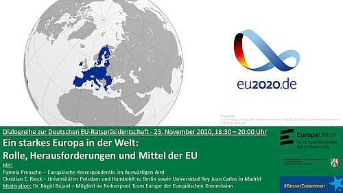 Gemeinsam mit der Europa-Union Bonn/Rhein-Sieg lädt die Europa-Union NRW im Rahmen der Projektreihe zur deutschen EU-Ratspräsidentschaft am 23. November von 18:30-20:00 Uhr zu einer Online-Debatte ein. Gäste sind Pamela Preusche, Europäische Korrespondentin im Auswärtigen Amt und Christian E. Rieck, Universitäten Potsdam und Humboldt zu Berlin sowie Universidad Rey Juan Carlos in Madrid, die Moderation übernimmt Dr. Birgit Bujard, Mitglied im Rednerpool Team Europe der Europäischen Kommission.   » weiterlesen