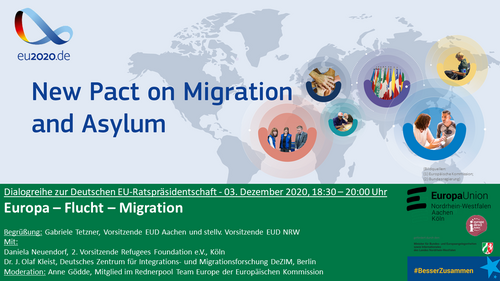 Am Donnerstag, dem 03. Dezember von 18:30-20:00 Uhr laden wir gemeinsam mit den Kreisverbänden Aachen und Köln zu einem Online-Dialog zum Thema „Europa – Flucht – Migration“ ein. Der Online-Dialog beschäftigt sich mit der EU-Migrationspolitik in ihren direkten Auswirkungen vor Ort in Lesbos und Samos und den neuen Vorschlägen der EU-Kommission für ein Migrations- und Asylpaket. Gäste sind Daniela Neuendorf, 2. Vorsitzende Refugees Foundation e.V., Köln und Dr. J. Olaf Kleist, Deutsches Zentrum für Integrations- und Migrationsforschung… » weiterlesen
