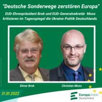 In einem Gastbeitrag für den Tagesspiegel kritisierten EUD-Ehrenpräsident Brok und EUD-Generalsekretär Moos die Ukraine-Politik Deutschlands: „Deutsche Eliten zeigen Verständnis für vermeintlich…
