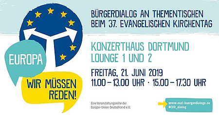 Im Rahmen ihrer Diskussionsreihe lädt die Europa-Union zusammen mit JEF und dem Kirchentag unter dem Motto „Europa – Wir müssen reden!“ am 21. Juni im Konzerthaus Dortmund (Lounge 1 und 2) ein zum Bürgerdialog. In unseren Diskussionsrunden von 11 bis 13 Uhr und von 15 bis 17.30 Uhr können Interessierte in direkten Austausch mit politischen Entscheidungsträgern und Experten aus Kirche, Wissenschaft, Zivilgesellschaft und Wirtschaft treten.