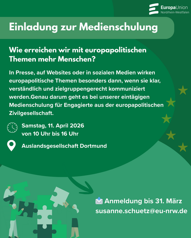 Die Schulung richtet sich an Ehren- und Hauptamtliche aus der Europa-Union NRW, aus Städtepartnerschaftsvereinen, bilateralen Gesellschaften sowie aus weiteren Organisationen der Europaarbeit. Neben fachlichem Input bietet die Veranstaltung auch Raum für Austausch, Vernetzung und das Teilen von Erfahrungen.