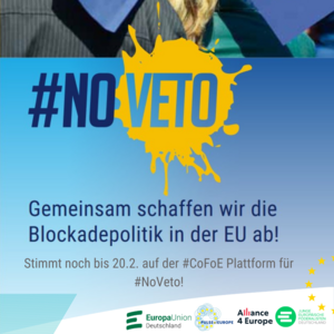 Die Konferenz ist die beste Gelegenheit seit 20 Jahren, um für föderalistische Reformen der EU zu werben. Deshalb haben Europa-Union und JEF gemeinsam mit Pulse of Europe und der Alliance for Europe die #NoVeto-Kampagne ins Leben gerufen. Gemeinsam fordern wir die Europäische Union auf, das Einstimmigkeitsprinzip im Rat der EU abzuschaffen.