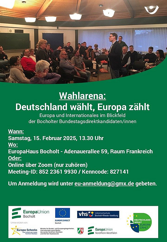 Die Wahl-Arena zur Bundestagswahl veranstaltet die Europa-Union Bocholt e.V. - Kreisverband in der EUREGIO auf Beschluss des Landesverbandes in Kooperation mit europe-direct Bocholt und der VHS Bocholt-Rhede Isselburg. Ihre Anmeldung ist per Mail unter : eu-anmeldung@gmx.de erforderlich! Sie können aber auch online über unsere ZOOM Veranstaltung: