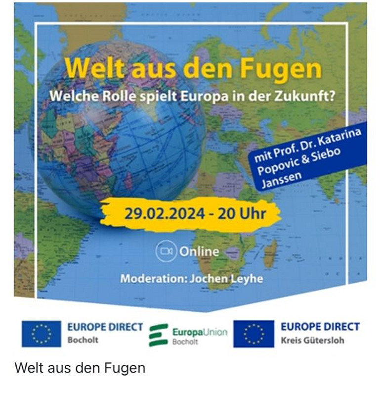 Siebo Janssen als Europa-Experte beleuchtet zusammen mit Prof. Dr. Katarina Popovic die Thematik. Jochen Leyhe moderiert die Veranstaltung. Die Referentin und die Referenten freuen sich auf die Fragen und Beiträge der Teilnehmerinnen und Teilnehmer.